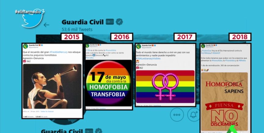 Para responder tanto a Vox como a Abogados Cristianos, Dani Mateo repasa en El Intermedio los tuits que la Guardia Civil ha puesto desde 2015 contra la homofobia y la discriminación. Además, lo hizo con ministros del interior del PP como Zoido y Fernández Díaz, lo que ha demostrado que "la Guardia Civil es el Cuerpo de Seguridad del Estado más Gayfriendly".