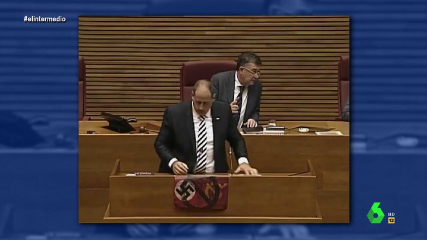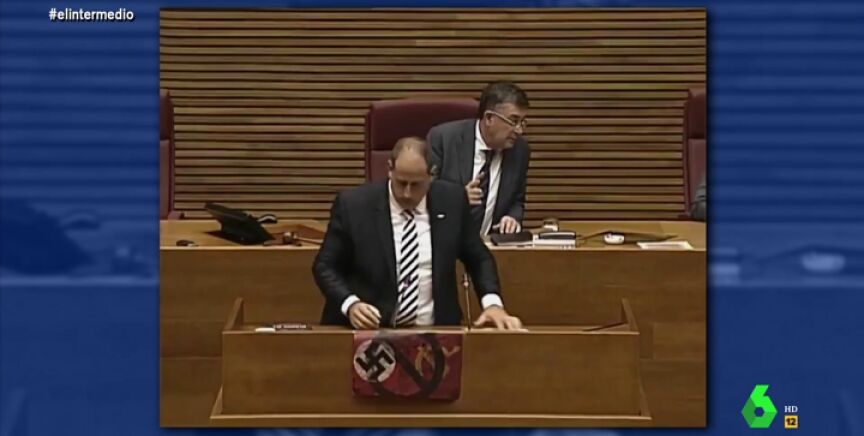 David García, diputado de Vox en las Cortes Valencianas, ha mostrado una esvástica y una hoz con un martillo en un pleno de la cámara, pero se le olvidó cuidar un detalle que Dani Mateo no ha dejado pasar desapercibido en El Intermedio.