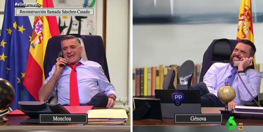 El departamento de reconstrucciones ficcionadas de El Intermedio ha accedido en exclusiva a la última llamada telefónica entre Pedro Sánchez y Pablo Casado, tras 55 días sin dirigirse la palabra. El Gran Wyoming, en el papel de Pedro Sánchez llama desde Moncloa a Dani Mateo, el líder del PP, que le increpa nada más descolgar el teléfono: "Benditos los oídos ¿Qué pasa, que ya has terminado de hablar con tus amiguitos los batasunos y has decidido llamar al líder de la oposición?". "Para hacer oposición ya tengo al otro Pablo", responde Wyoming.
