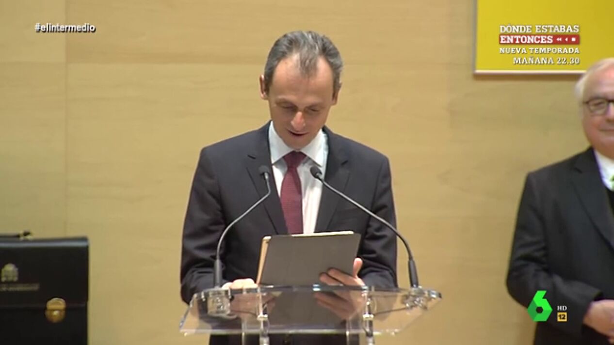 El mal rato de Pedro Duque, ministro de Ciencia, al tratar de manejar un iPad para leer su discurso