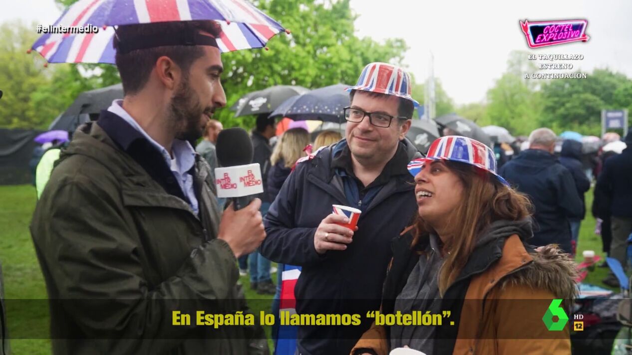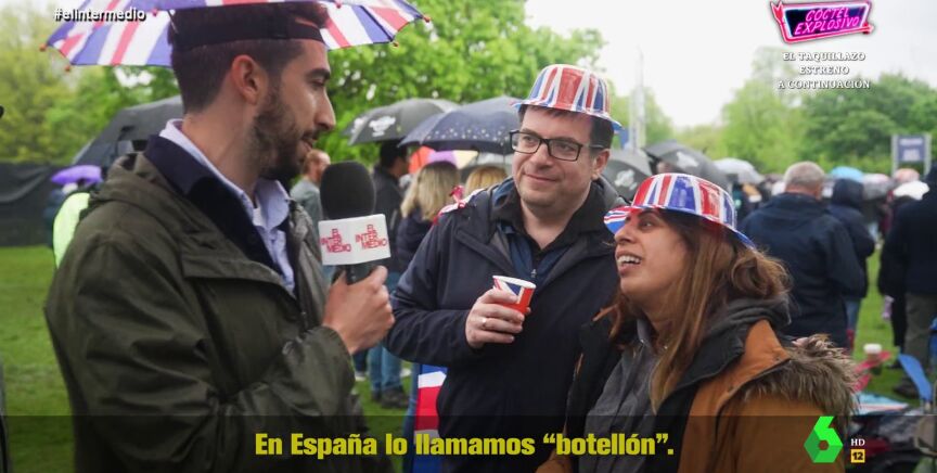 Por suerte consigue llegar a un parque donde conversa con varios británicos que celebran la coronación con un picnic: "Hemos traído comida y alcohol, prosecco, ginebra y todos estamos muy contentos de estar aquí hoy", le comenta una mujer. "Esto es una especie de botellón, en España lo llamamos botellón", le responde el reportero de El Intermedio, que le plantea escoger entre Carlos o Guillermo. "Ha esperado 53 años para esto, démosle su pequeño momento de gloria", afirma esta mujer británica decantándose por el recién coronado rey.