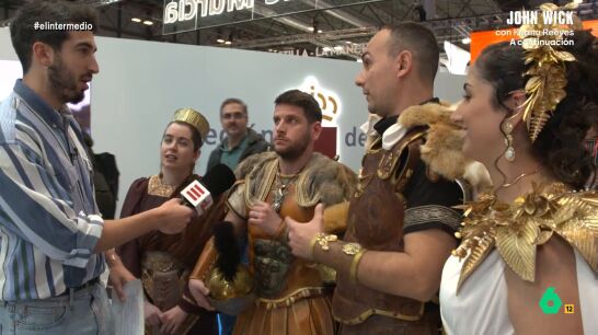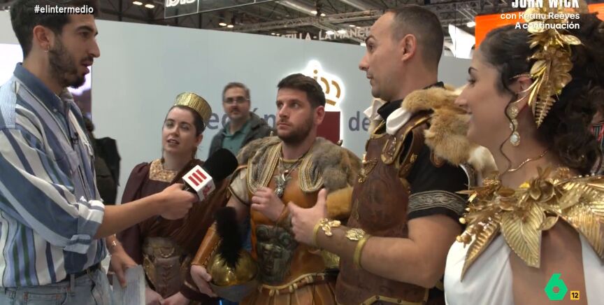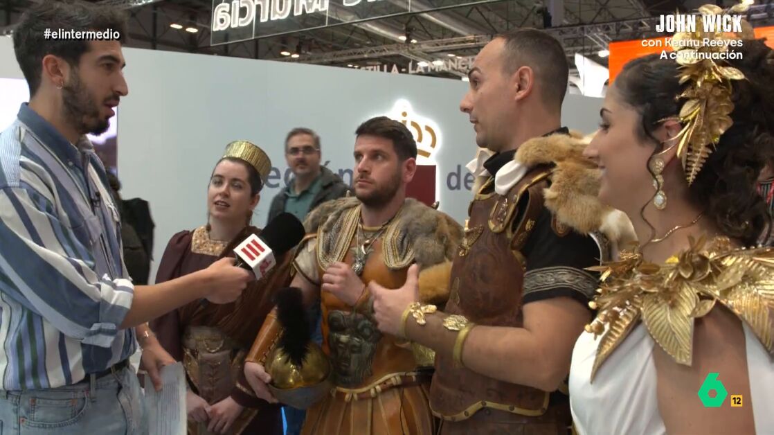 Mientras camina por la feria se encuentra con dos chicos y dos chicas que van vestidos de romanos y cartagineses. "Yo soy Escipión y él es Anibal", le cuenta un chico, "somos contrincantes". Juárez se interesa por saber si en FITUR se liga. "Si, se ha dado un salseo púnico", responde uno de ellos, "pero las chicas saben más de eso".