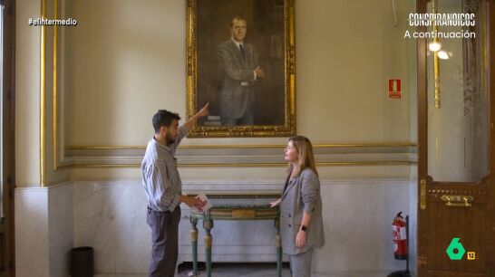 El reportero visita la sede de la Bolsa de Madrid. Juárez descubre en el 'Salón de fumadores' un cuadro muy especial que capta su atención: el del rey emérito.