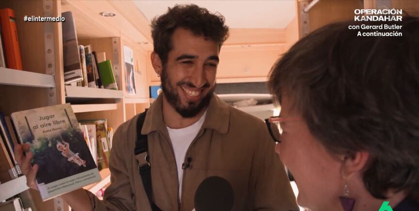 En la furgoneta cultural no solo hay libros, también revistas y películas. Sin embargo, Isma Juárez detecta una ausencia llamativa en el catálogo: el libro de El Gran Wyoming. "Eh...no, no lo tenemos, creía que me lo ibas a traer tú", le responde Aurora entre risas.