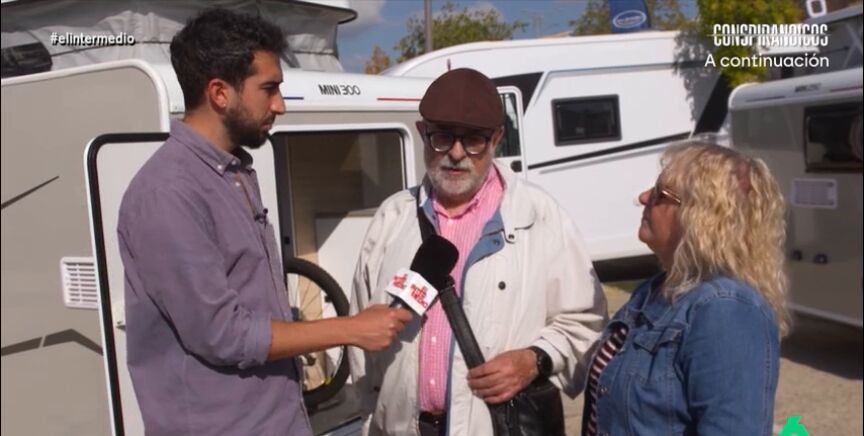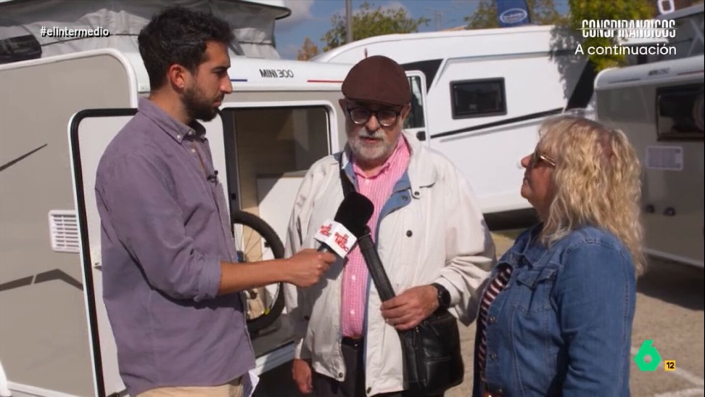 El reportero charla con un matrimonio en una feria dedicada a estos vehículos que le explican que han ido a curiosear debido a que se están planteando renovar su caravana a un modelo más moderno.