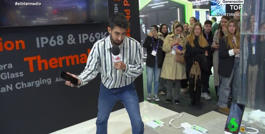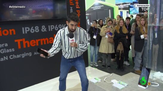 El reportero descubre un stand que garantiza tener el móvil más poderoso y resistente de la tierra. "Es resistente al agua, al polvo y a los golpes", le cuenta uno de los responsables del stand. Isma propone coger uno de los móviles y demostrar todas sus bondades. Para ello, lo lanza contra una peana para ver si se rompe y, el teléfono, sale indemne pero el reportero rompe la peana.