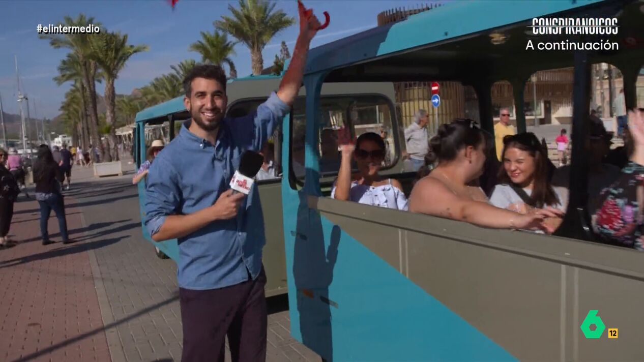 "Cruceristas, os recibimos con alegría, dejaos la pasta en algo que no sea sangría", les canta el reportero a un grupo de turistas que le aseguran que se han conocido en el crucero: "Es el barco del amor, como el Titanic. Espero que tengáis más suerte que ellos", les desea.