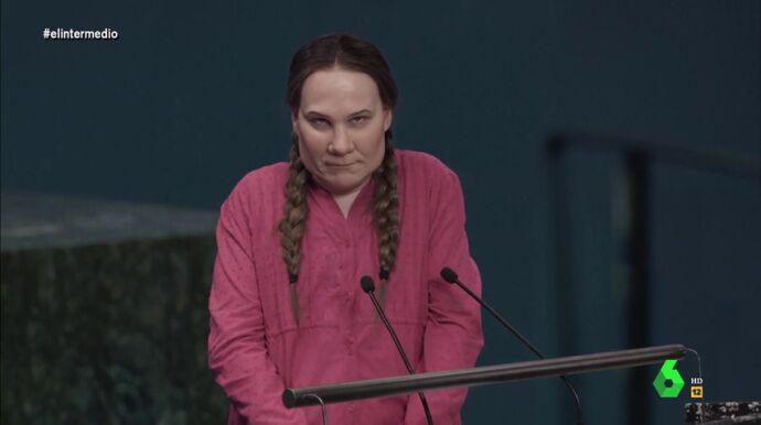 La activista sueca recuerda en El Intermedio su discurso ante los líderes mundiales en la cumbre del clima en las Naciones Unidas. "Todo esto se me ocurrió a mí, menudo pico tengo y cómo me puse... Empiezo a pensar en el agujero de ozono, en el Amazonas ardiendo, en un pingüino agonizando, en la separación de One Direction... Soy activista pero también tengo 16 años", asevera. También habla de su encuentro con Trump en la ONU: "Me dio unas ganas de cogerle del pescuezo...".