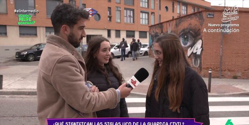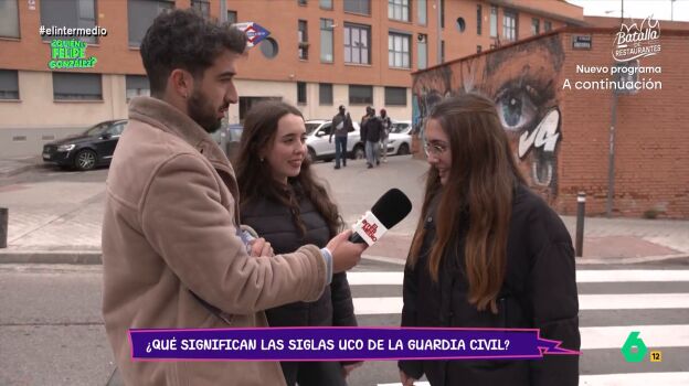 Por otro lado, Isma Juárez anima a otras chicas a participar en el concurso con una nueva pregunta: "¿Qué significan las siglas de la UCO de la Guardia Civil?". Las respuestas dejan al reportero descolocado y a punto de romper a reír. "Unidad contra la corrupción de" y "Unidad corrompida organizada", responden las jóvenes.