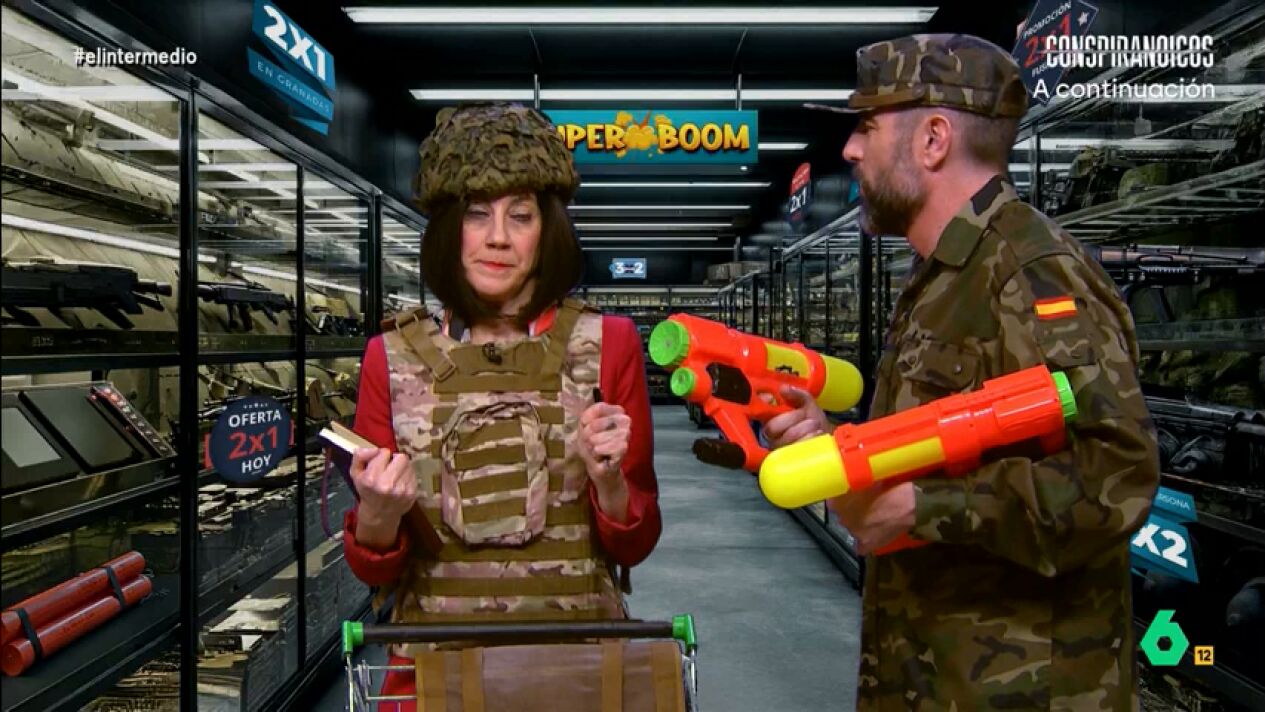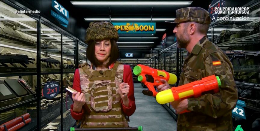 Cristina Gallego se convierte en 'Margarita Robles', que en sus esfuerzos por aumentar el presupuesto para Defensa, visita un supermercado de armas acompañada del 'recluta' Dani Mateo, que le muestra cuchillos "más afilados que los que nos clava Junts".