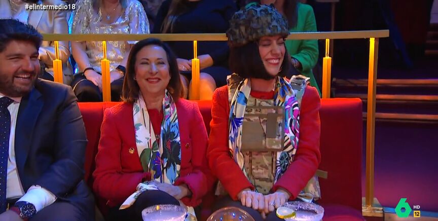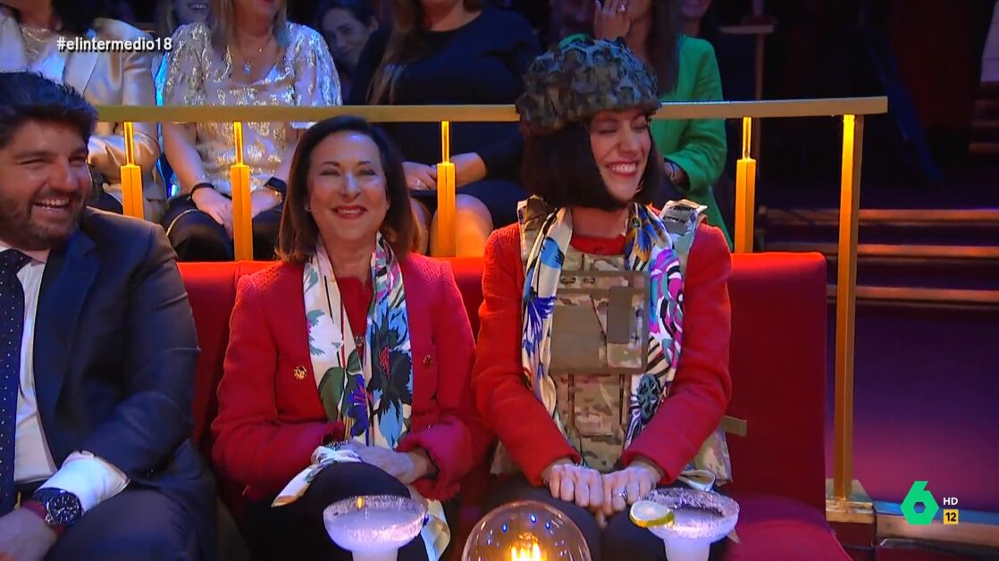 La ministra de Defensa, sentada en la primera fila del público, charla con Cristina Gallego, que se convierte, un día más en ella para el aniversario de El Intermedio. Las ministras de Defensa brindan con un margarita por el programa.