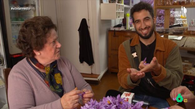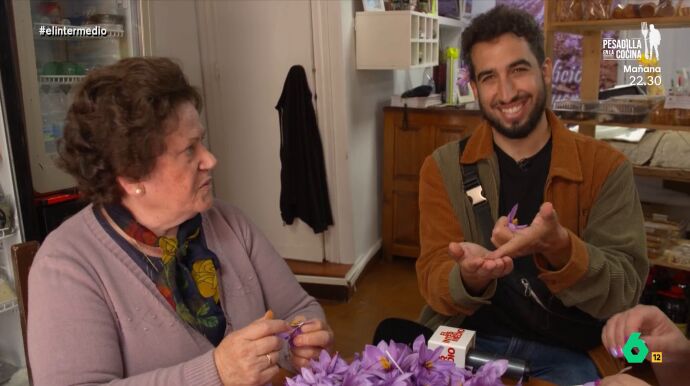 El reportero Isma Juárez ha aprendido gracias a Inma Moreno y Demetria Gallego cómo se monda el azafrán, un proceso a través del cual se retiran los estigmas de la flor para después secarlos.