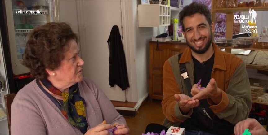 El proceso de mondar, como le explican, es sacar el estigma limpio de la flor. "Hay que sacar lo rojo", indica, "lo amarillo no vale para nada". Isma demuestra que es buen aprendiz ya que consigue sacar los tres "clavos" de azafrán sin romperlos. "Lo has hecho super bien, impresionante", le dice Inma.