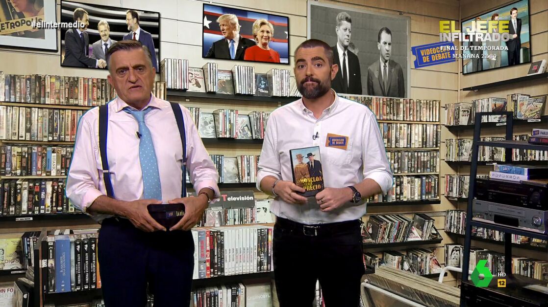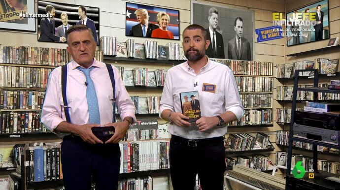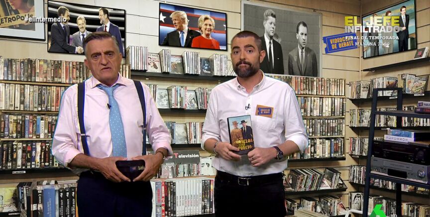Dani Mateo recomienda a El Gran Wyoming algunos títulos de los debates electorales para visionar en casa antes de las elecciones y le ofrece un clásico, 'Los candidatos de la mesa cuadrada', una obra de 1993 protagonizada por Felipe González y José María Aznar y dirigida por Manuel Campo Vidal, en la que se debatía si era mejor debatir de pie o sentado. "Si se hiciera un remake ahora, se sentarían en la misma mesa", señala el colaborador.