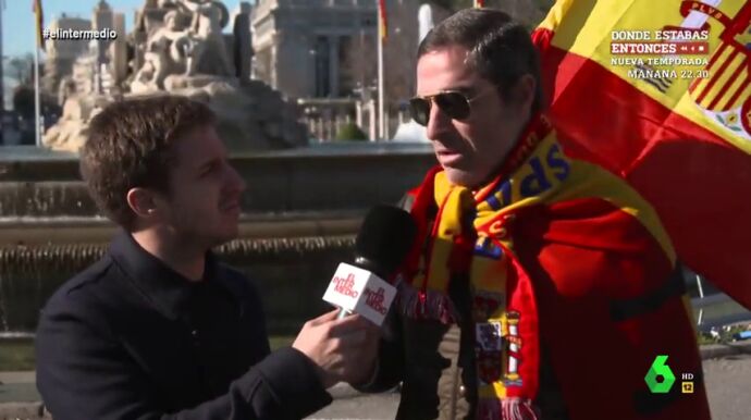 En otro programa, El Gran Wyoming mostró el patriótico vídeo con el que Vox pedía a los españoles que se movilizasen contra el Gobiernpode Sánchez. Eso sí, una versión "mejorada" de El Intermedio con un mensaje "más real" y protagonizado por Bertín Osborne y Julio Iglesias.
