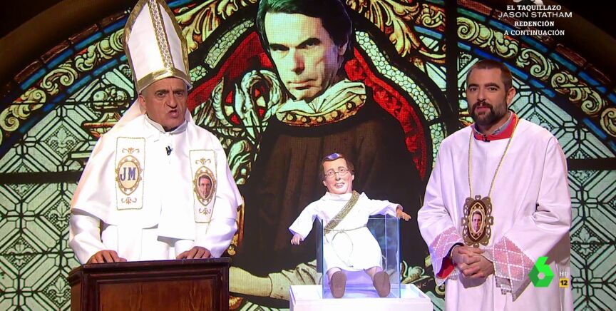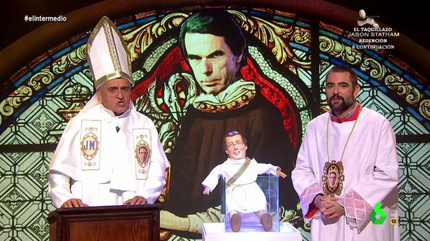 "Ha creado al 'santo niño Almeida' a su imagen y semejanza", indica el 'Papa', y el 'monaguillo' añade que "cuesta diferenciar quién es más cuñado". El jefe de la Iglesia Aznariana comenta que el 'Señor' ha marcado a su elegido cuál es el camino a seguir para retener la alcaldía de Madrid y la de cualquier otro lugar: "Hablar de Sánchez, de Euskadi y de Cataluña". "Líbranos Aznar de los independentismos, que a España enfangan", ruega.
