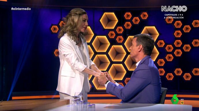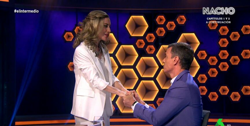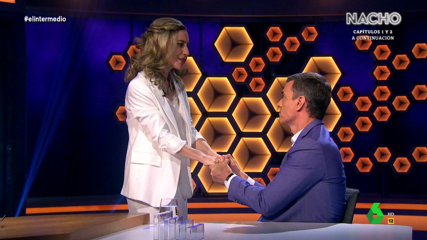 El presidente del Gobierno coincide con 'Yolanda Díaz', interpretada por Cristina Gallego, durante su entrevista en El Intermedio y esta le asegura que tienen "mucho futuro juntos".