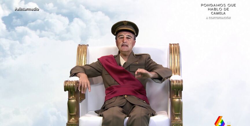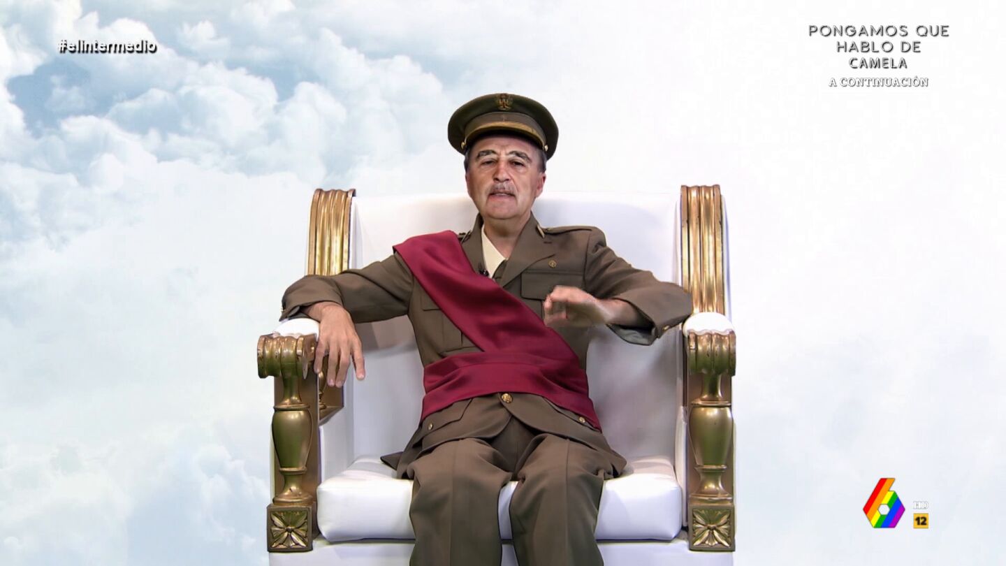 "Desde que estoy aquí me río muchísimo con lo que pasa en España", asegura 'Franco' a El Gran Wyoming. Sin embargo, hubo un hecho que no le hizo "ni puñetera gracia": la exhumación de sus restos del Valle de los Caídos. "¡No lo entiendo!", se queja enfadado al presentador, y repasa "la de cosas" que le dio a España, como "pantanos, orden y ley y una cruz que se ve desde el espacio".