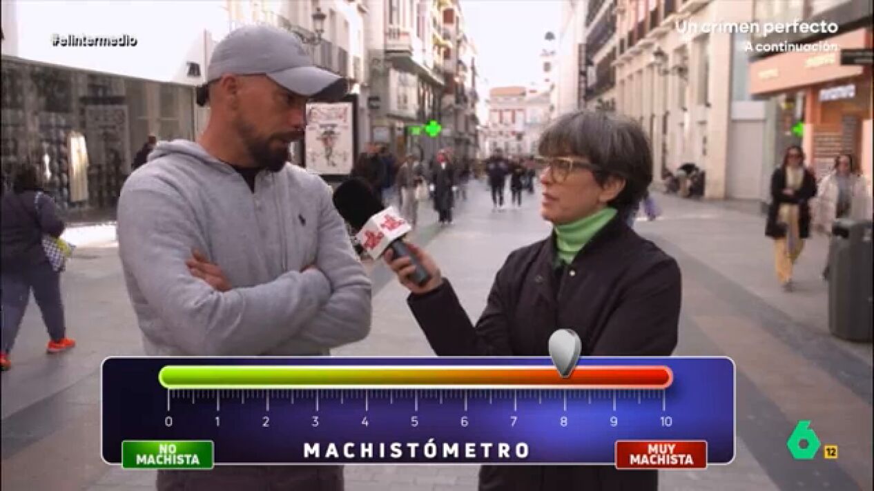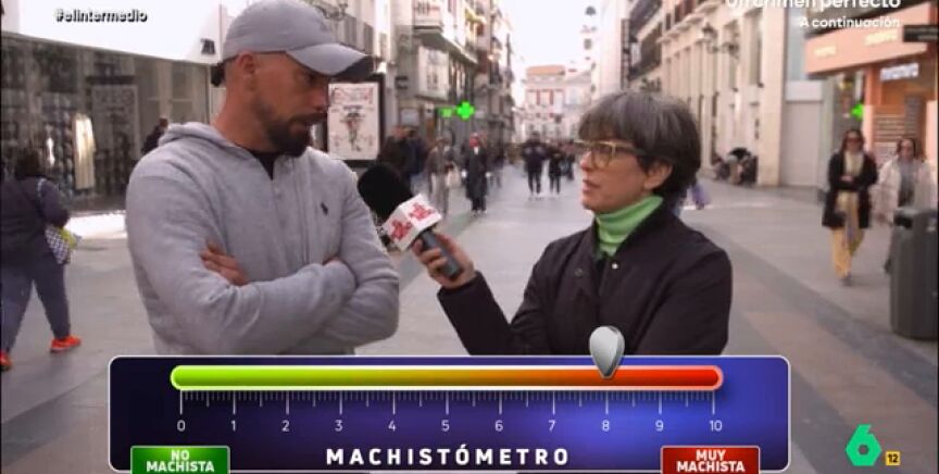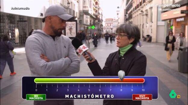"Y como macho, usted domina", afirma la reportera alucinada con las palabras del hombre, que le contesta con otra respuesta machista: "No, intento hacer mi papel, que es el de proteger a la hembra". Además, cuando Thais Villas le pregunta si sabe qué se celebra el 8M, su respuesta es tajante: "Sí, eso de que os sentís inferiores con respecto al hombre". Por su parte, otro hombre se pone un cinco en el 'machistómetro' argumentando que tiene "tres mujeres en casa" por lo que él también lucha contra el machismo.
