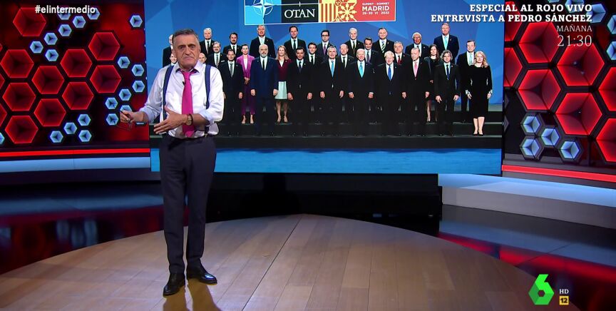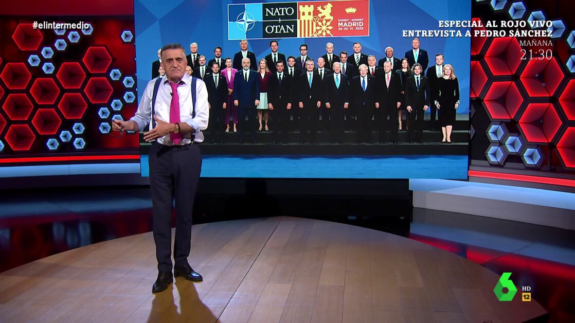 El Gran Wyoming analiza en El Intermedio la foto de familia de la cumbre de la OTAN que, en opinión del presentador, "parece un campo de nabos": de los 31 "líderes del mundo libre" que aparecen en ella, solo cuatro son mujeres.