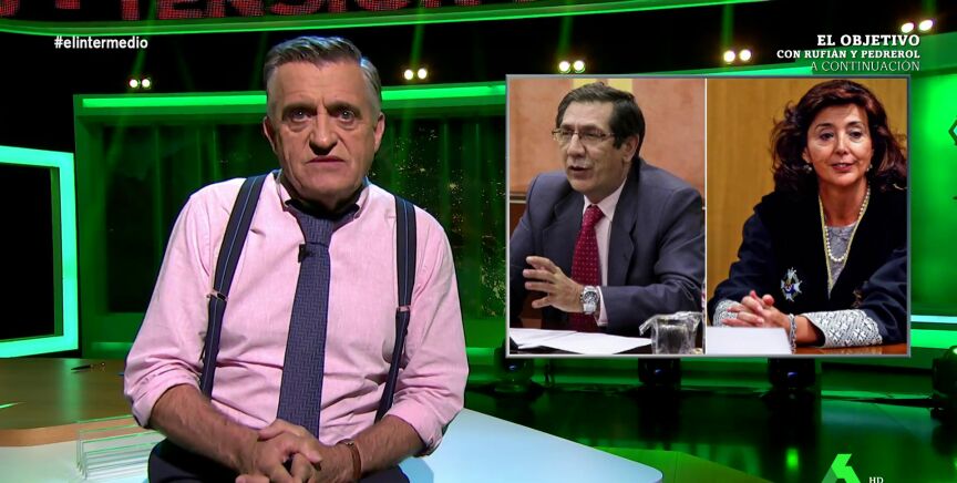 El Gran Wyoming se desplaza hasta el pico de la mesa de El Intermedio para analizar la votación que este jueves tendrá lugar para renovar al Tribunal Constitucional y que, en principio, meterá a Enrique Arnaldo. Y es que el presentador afirma que "la imagen del Constitucional quedará dañada porque entrará a formar parte de una institución tan importante un magistrado que no solo está claramente politizado sino que se ha visto relacionado con numerosos escándalos y casos de corrupción".