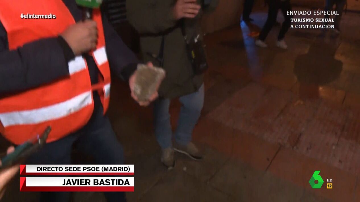 Entre los múltiples objetos lanzados, se encontraban varios adoquines que estuvieron cerca de impactar contra Javier Bastida, periodista de laSexta presente en el lugar y que mostró el objeto en cuestión en directo en El Intermedio.