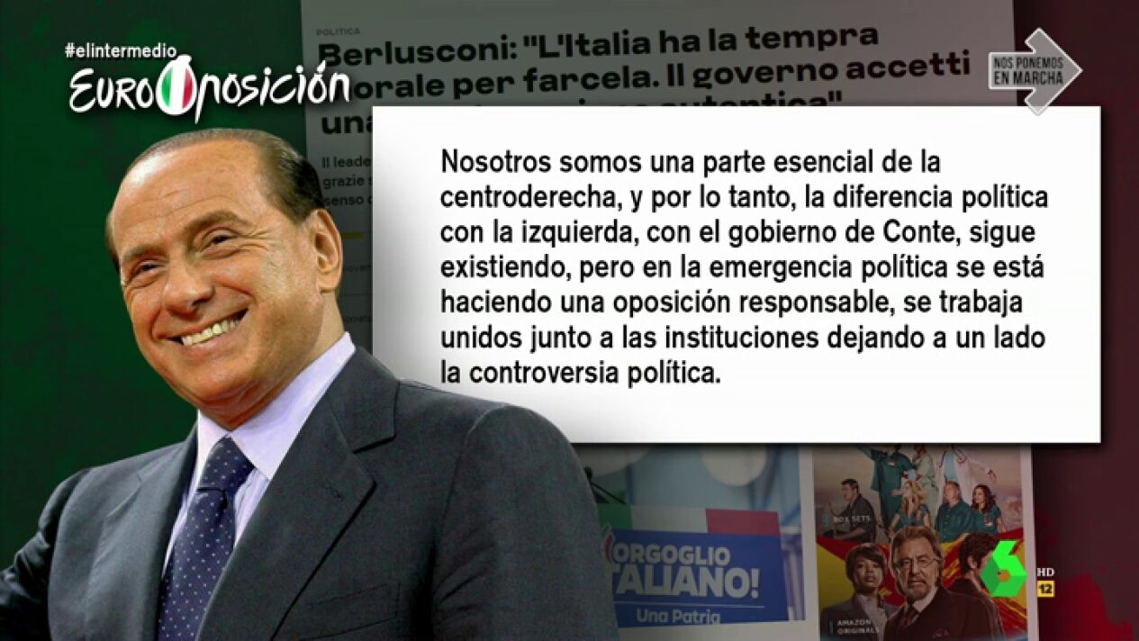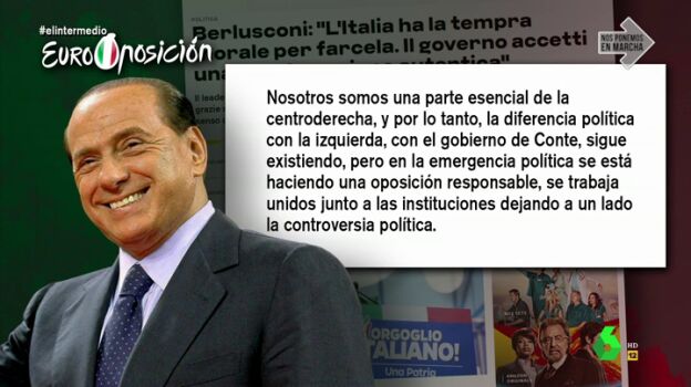 En Italia la situación es diferente. El Gobierno de Conte está teniendo que lidiar con la pandemia y con las críticas de la Liga Norte de Mateo Salvini. Sin embargo, otras figuras políticas como la de Silvio Berlusconi han tomado la iniciativa de dejar de lado la polémica para seguir el ejemplo de la responsabilidad institucional.