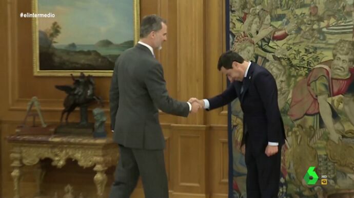 El presidente andaluz estaba realmente "emocionado con el encuentro", se acerca, le da la mano e inclina el cuello "casi 90 grados": "No sabemos si Juan Manuel Moreno Bonilla está diciendo Majestad le ofrezco mis respetos o le ofrezco mi cuello para que me de una colleja", ha apuntado Wyoming.