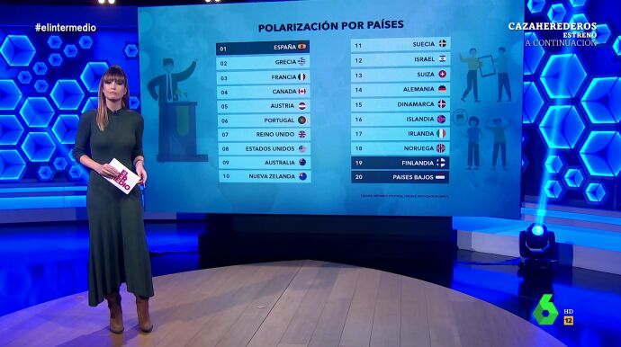 Un estudio internacional ha concluido que España es el país más polarizado de los 20 analizados. Sandra Sabatés analiza las conclusiones de esta investigación en El Intermedio.
