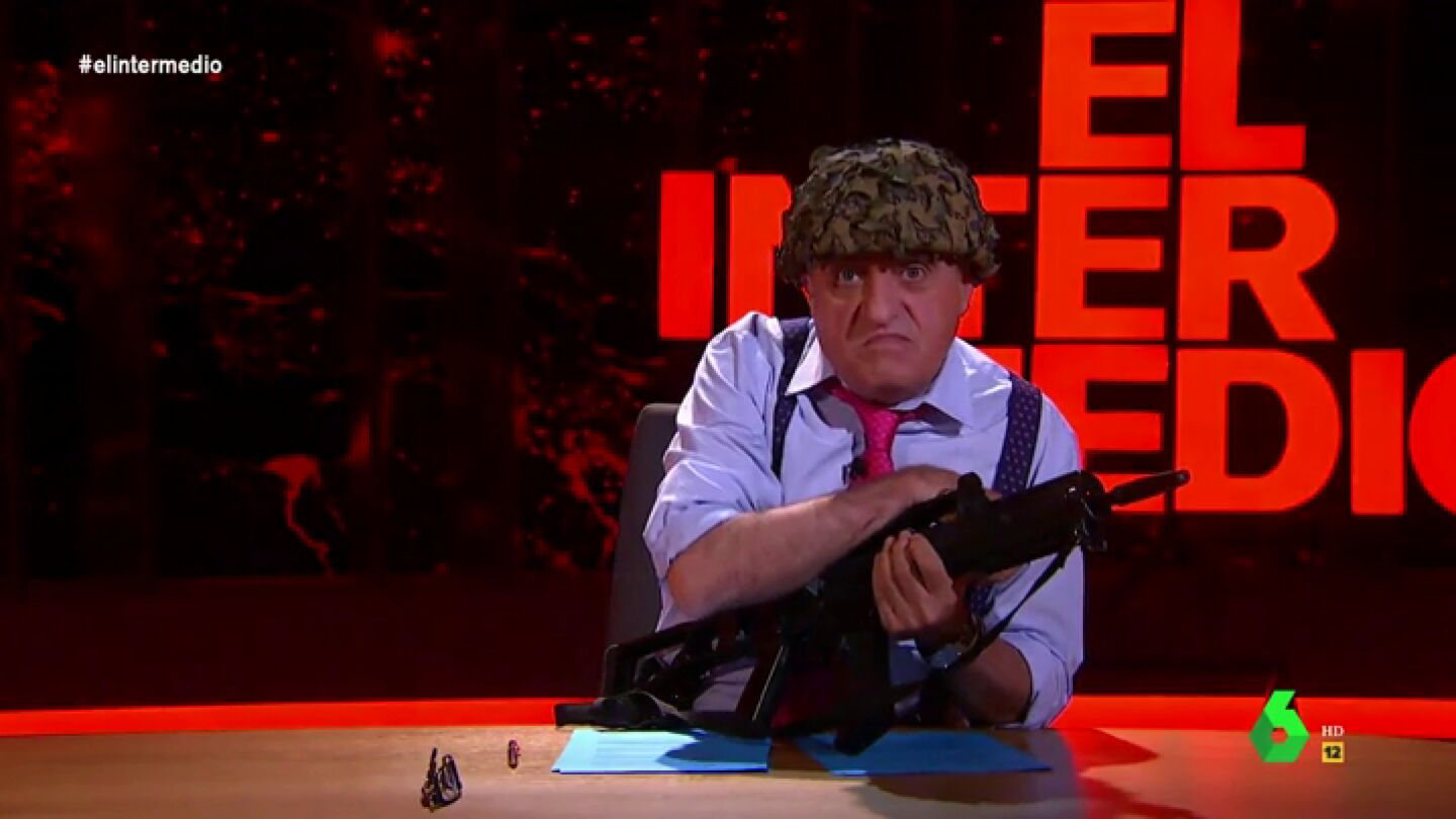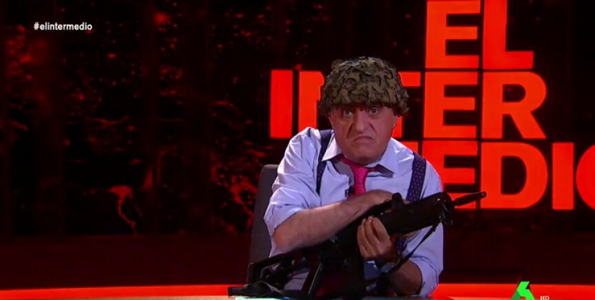 Ataviado con un arma y un casco de militar, el presentador explica que "al soldado Toni Roldán no le tiembla el pulso aunque sea fuego amigo. Se va porque Ciudadanos parece un carrito, si te descuidas, se va a la derecha".