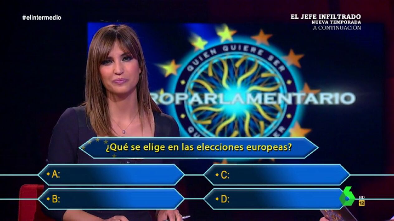 "¿Qué se elige en las elecciones europeas?" Es la primera pregunta que el presentador le lanza a Sandra Sabatés, que responde correctamente: "751 eurodiputados que componen el Parlamento Europeo".