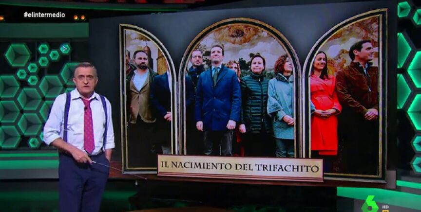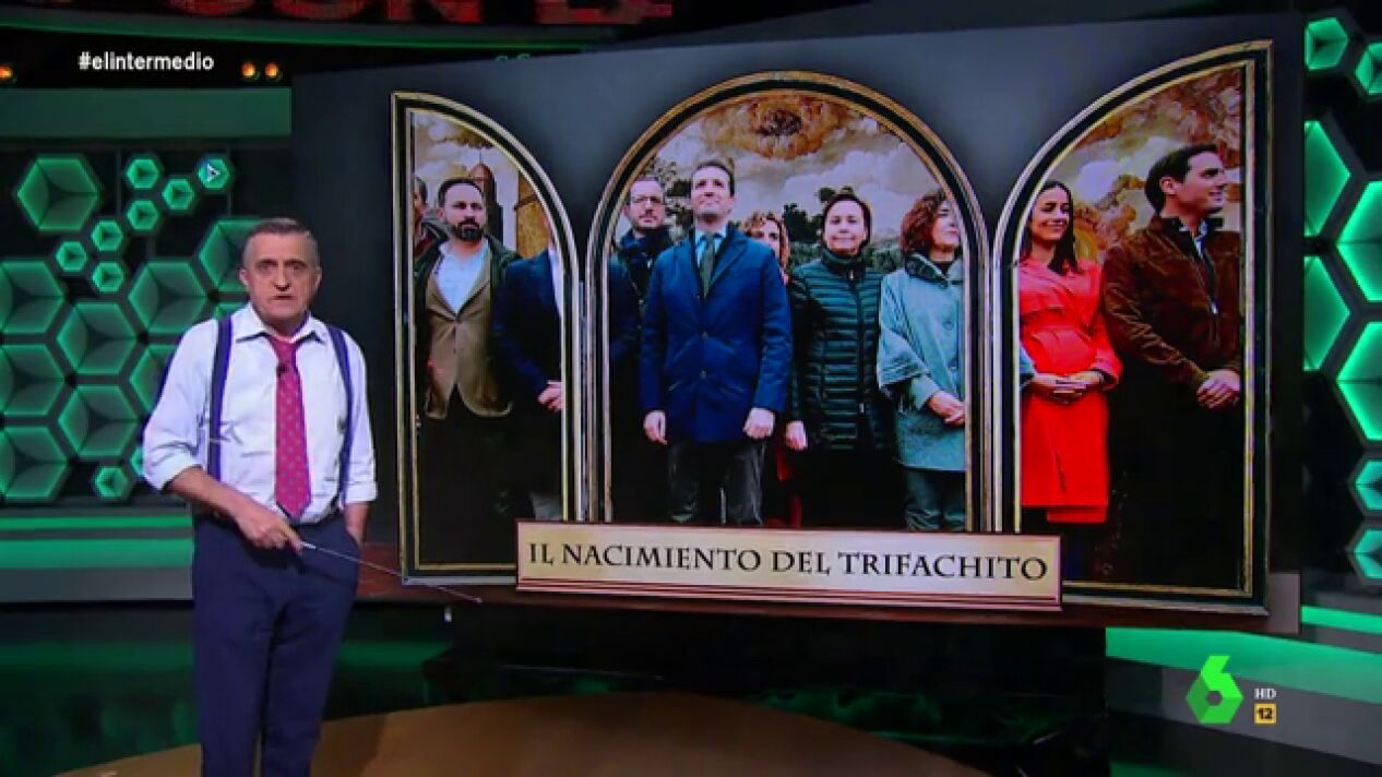 El Gran Wyoming destapa en su análisis de 'El nacimiento del trifachito' los detalles más minuciosos de la obra: "El 'Marqués de Riverino', está alejado y mira a otro lado porque estaba buscando la oficina del Inem más cercana".