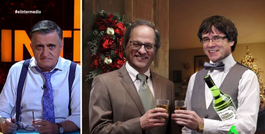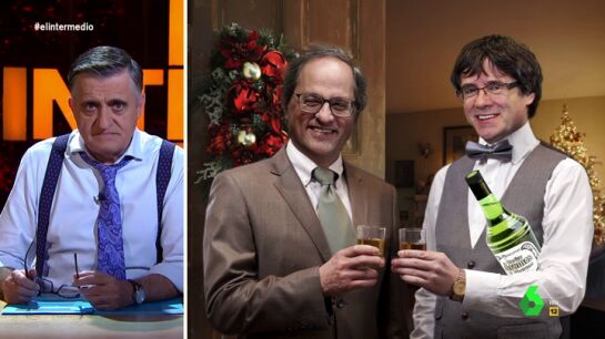 Mientras suena el mítico 'Vuelve a casa por Navidad', El Gran Wyoming recrea cómo podría ser ese idílico reencuentro: "Ya lo están visualizando. Nieva sobre Barcelona y Quim Torra está asando la tercera butifarra de la noche. Entonces alguien llama a la puerta y es el mismísimo Puigdemont. Ambos se funden en un abrazo y se pasan la noche compartiendo una botella de aromas de Montserrat".