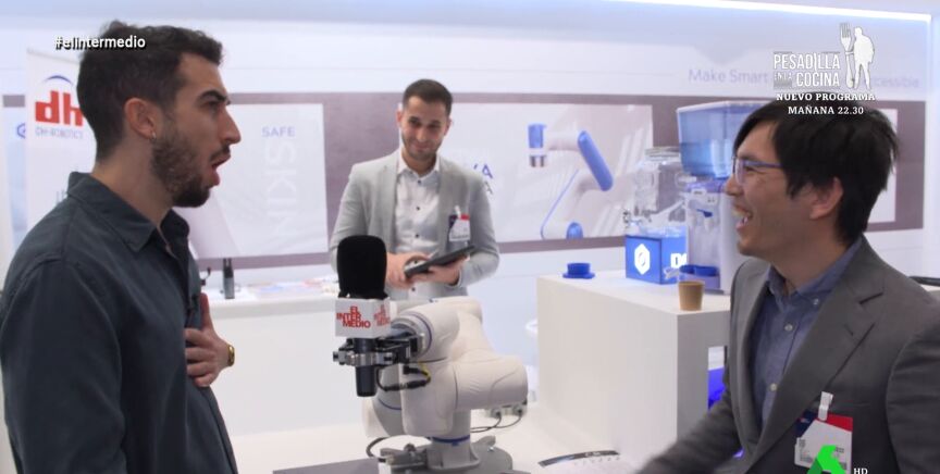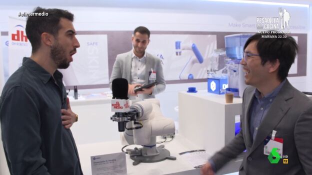 Otro hombre explica cómo una máquina enrosca o desenrosca tapones de las botellas u otro robot que rellena vasos. Pero, ¿Podría quitar el trabajo a las personas? "No, se le llama robot colaborativo porque colabora con los humanos", explica el hombre sobre el robot, al que Isma Juárez le pone un reto: sujetar le micro de El Intermedio.
