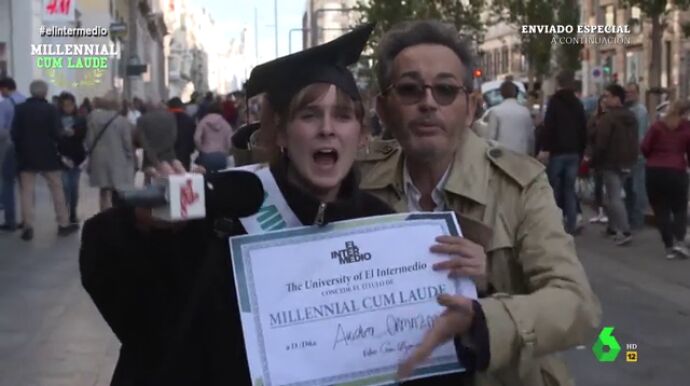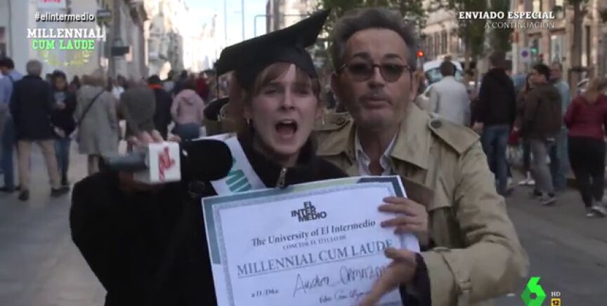 Santi Villas sale con El Intermedio a la calle para realizar el concurso 'Milennial Cum Laude', por el que se otorgará un diploma al joven que consiga contestar cuatro preguntas de política correctamente.