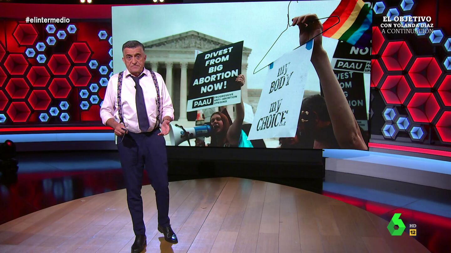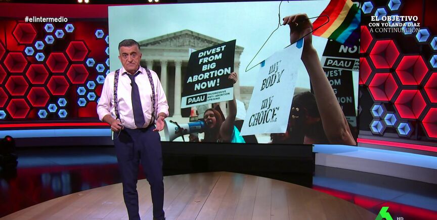 El Gran Wyoming saluda al público de El Intermedio en inglés porque se siente "vinculado sentimentalmente a los Estados Unidos". "Mi generación soñaba con EEUU, tenían todo aquello que deseaba cualquier joven español: elecciones democráticas y libertad sexual", explica el presentador, que está "muy preocupado" tras saber que el Tribunal Supremo de ese país podría derogar el derecho al aborto.