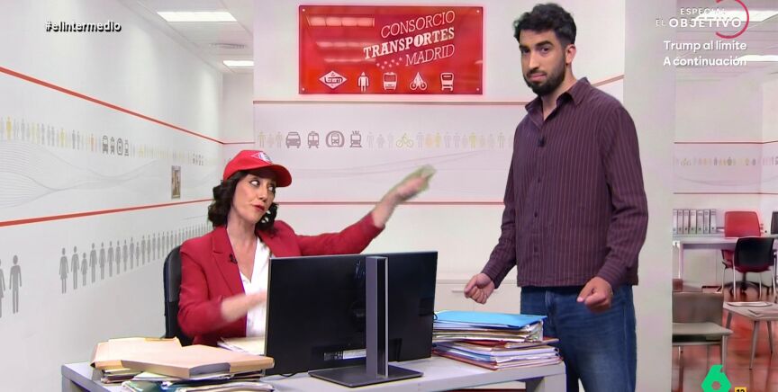 El Intermedio ha tenido 'acceso exclusivo' al interior de la oficina, donde se encuentra la propia 'Ayuso' tramitando el certificado. Dani Mateo es un migrante argentino que aparece con toda su documentación, incluida la "sangre de unicornio". "No va a ser tan fácil", comenta la 'presidenta', que le somete a un "test de madrileñidad".