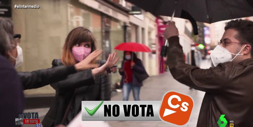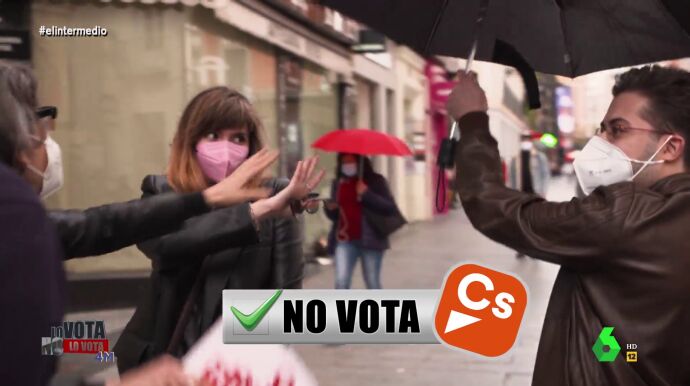 Uno de los concursantes, Pablo, debe de encontrar una persona que no vaya a votar a Ciudadanos. En su búsqueda elige a una pareja de amigos que van bajo un paraguas. Entre los dos, Pablo decide elegir al joven, que confiesa que va a votar a Isabel Díaz Ayuso. Una confesión que deja alucinada a su amiga, que sale inmediatamente del paraguas que están compartiendo: "Somos amigos, pero...". La joven confiesa que va a votar a Pablo Iglesias, algo que también sorprende a su amigo, que afirma que pensaba que iba a votar a Gabilondo. Puedes ver el cómico momento y la discusión de política entre ambos en el vídeo principal de esta noticia.