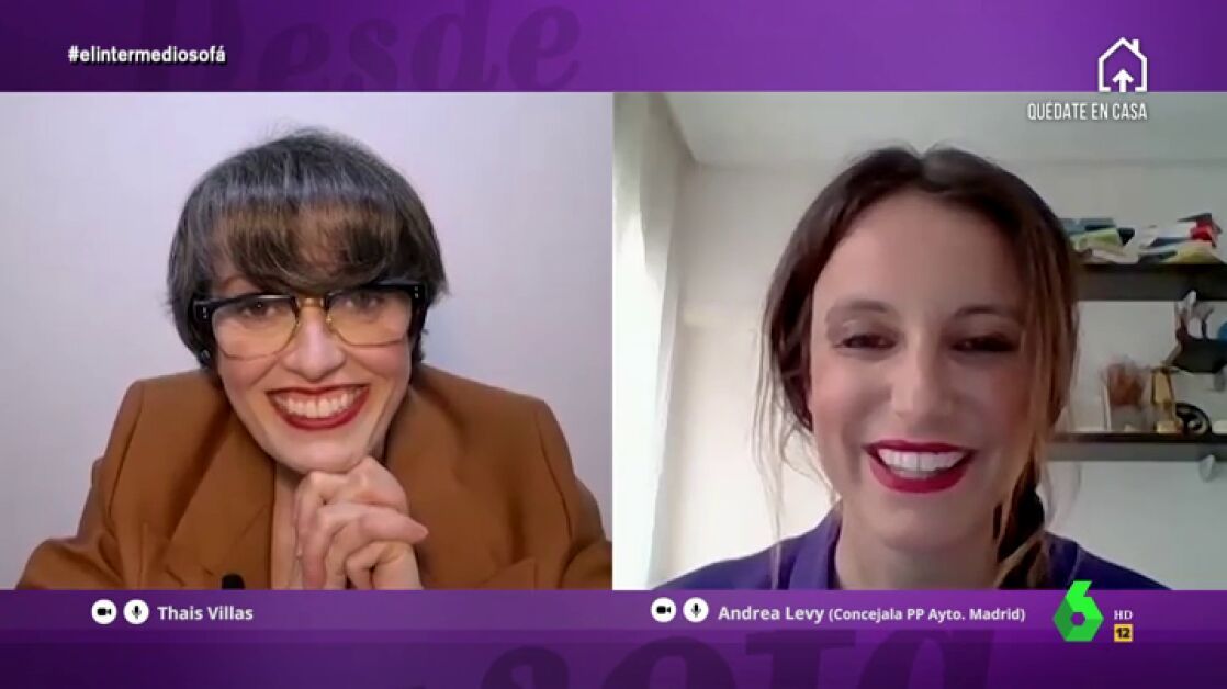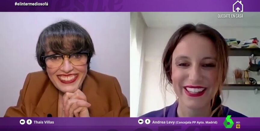 Thais Villas ha conseguido entrevistar a Andrea Levy en pleno confinamiento. La concejala de Cultura del Ayuntamiento de Madrid ha reconocido a la colaboradora de El Intermedio que su sofá se ha convertido en el centro de su existencia y que incluso la videollamada que han mantenido le ha dado "la vida".