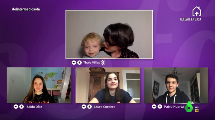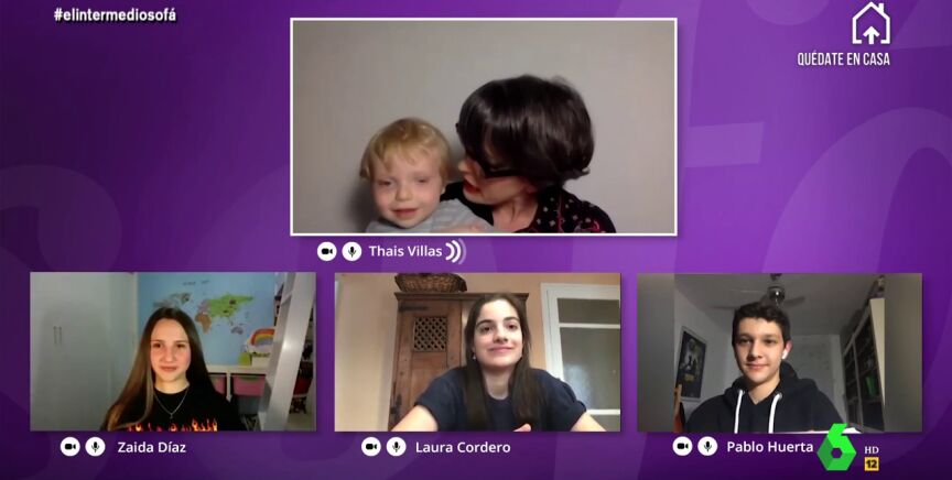 "¡Vete con tu padre!", exclama Thais Villas cuando su hijo la interrumpe en plena videollamada con varios adolescentes en El Intermedio. En este vídeo puedes ver la divertida reacción de todos al ver al pequeño.