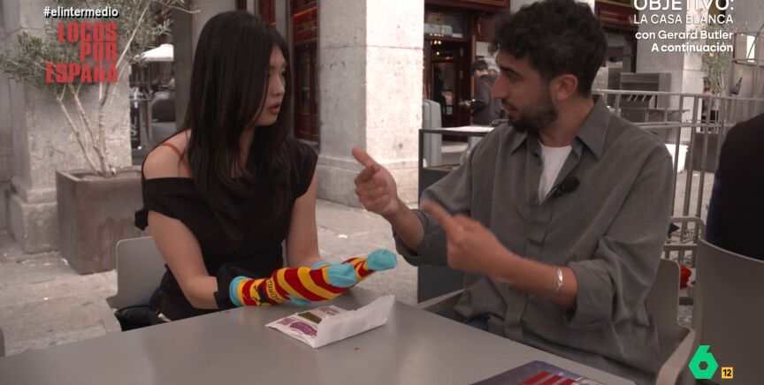 El reportero ha regalado a Kurum, una creadora de contenido coreana, unos calcetines muy particulares con un estampado con dos elementos que, como señala Isma, "no casan excepto en los suvenires de la plaza Mayor".