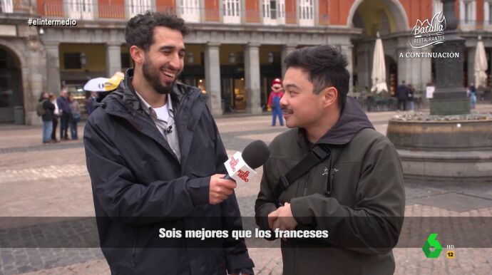 Isma asusta a dos personas que están haciendo una foto a la plaza mayor. El chico, Riley, le dice que es de Los Ángeles. El turista considera que los españoles son "muy agradables". Y, añade, "mejores que los franceses", algo que provoca la risa de Isma. El reportero le dice: "Somos los más divertidos del mundo, los más guapos...". Riley no duda en contestar a Isma: "Sí, pero creo que tú no", lo que deja sin palabras al reportero.
