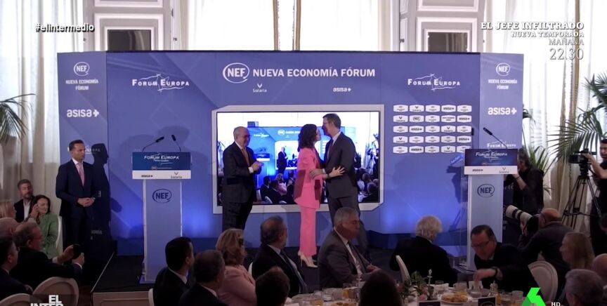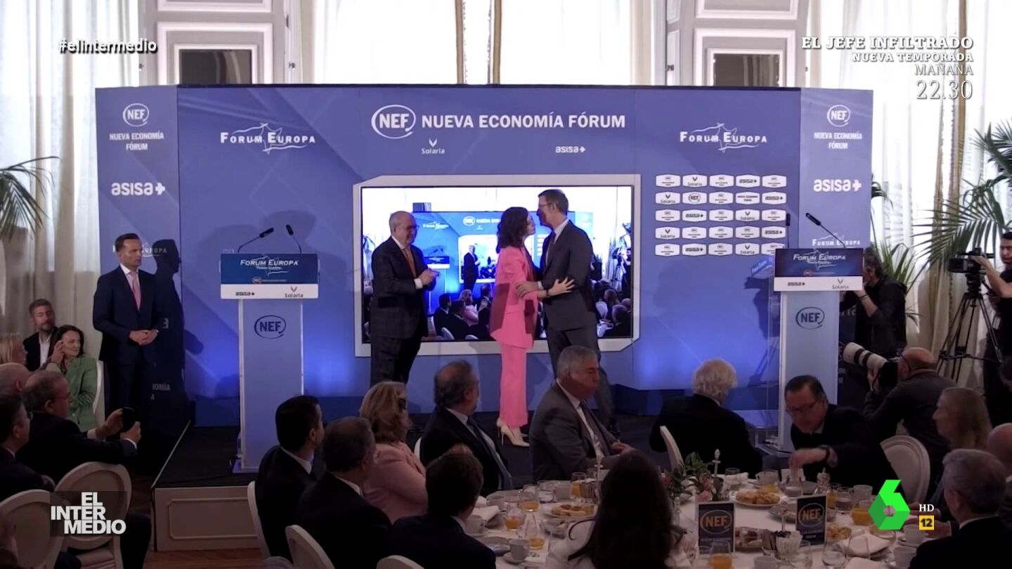 En este montaje de El Intermedio, Isabel Díaz Ayuso y Alberto Núñez Feijóo no paran da saludarse con besos hasta que el presentador debe interrumpirlos.