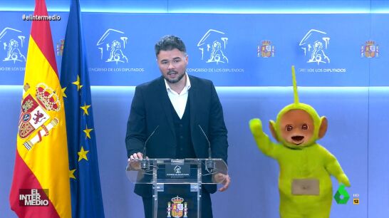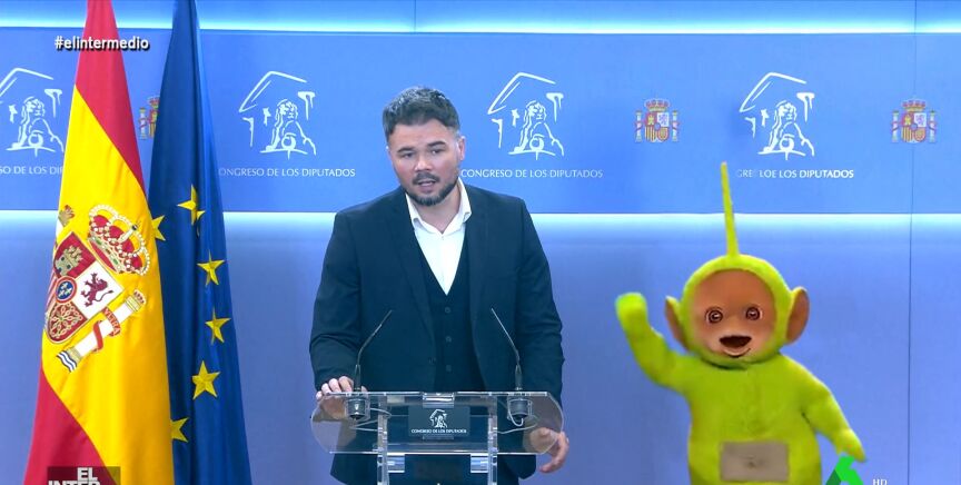 En este montaje de El Intermedio, el cabeza de lista de ERC en las elecciones generales acude a una rueda de prensa en el Congreso con uno de los "mejores diputados" y su "voz" en cuanto a sindicalismo de trabajo, el teletubbie Dipsy.