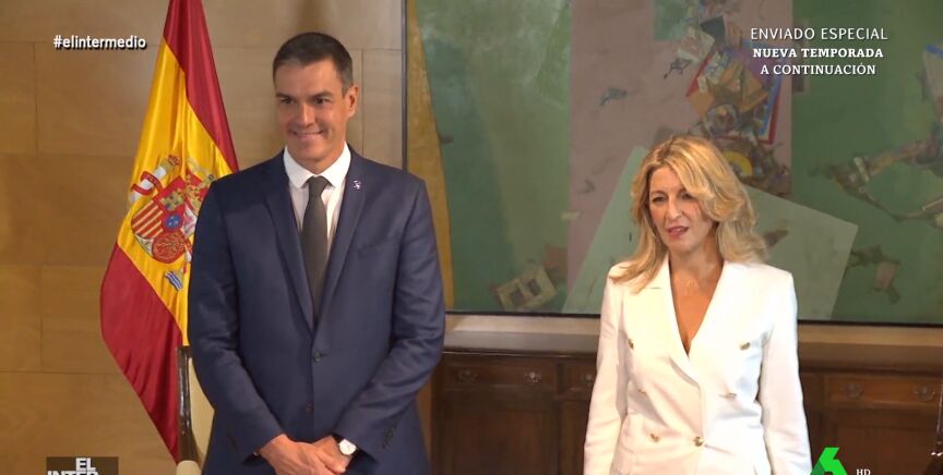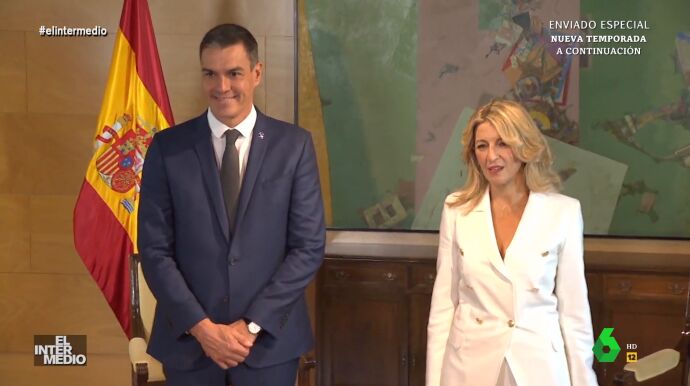 En este montaje de El Intermedio, el NODO retransmite la 'boda' de Pedro Sánchez y Yolanda Díaz tras el anuncio de su pacto de Gobierno. Cuando muestran la 'tarta nupcial', se cuela un invitado sorpresa que se puede ver en este vídeo.