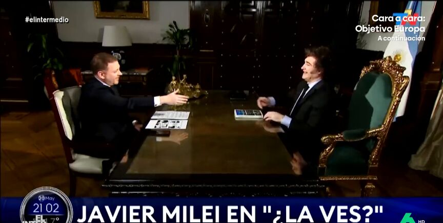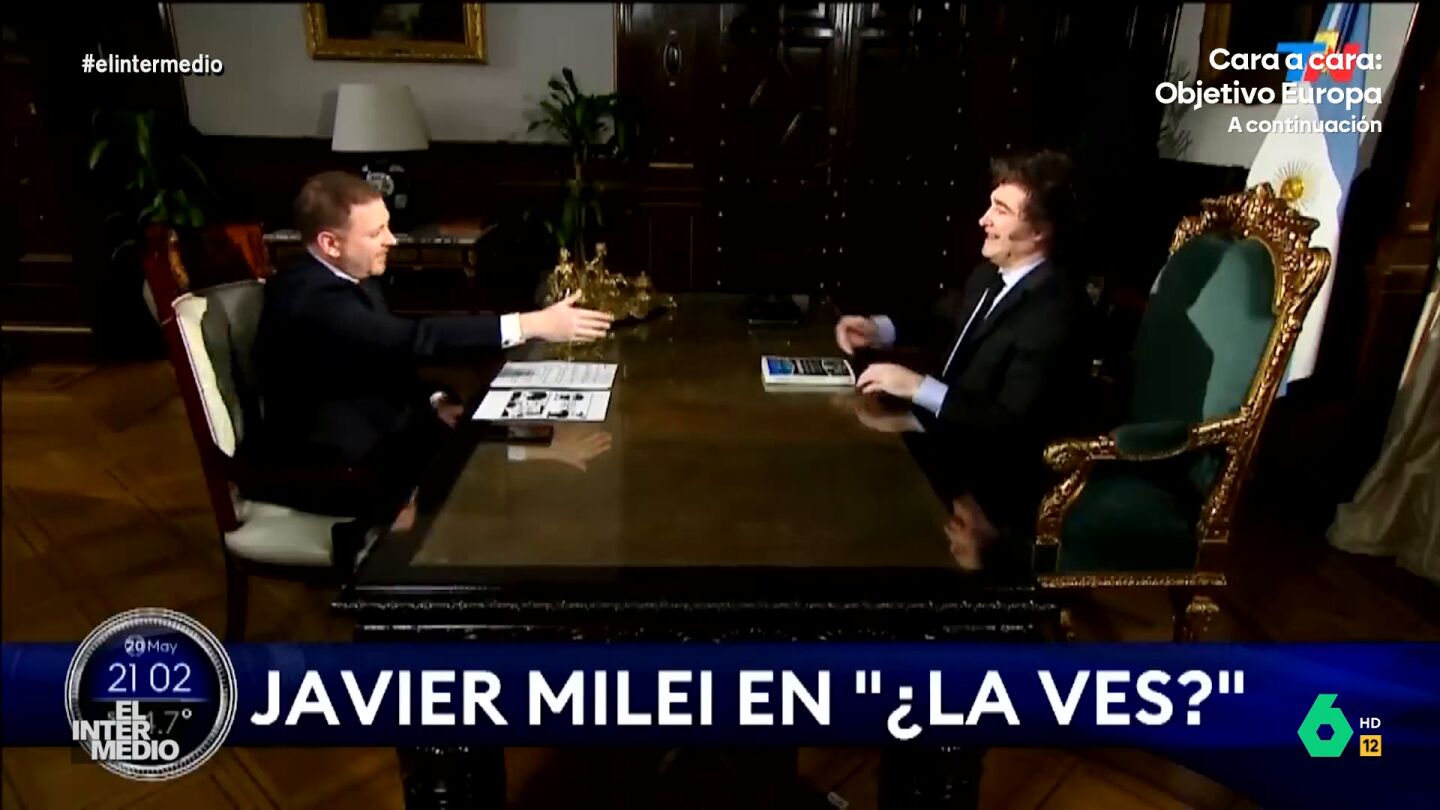 En este montaje de El Intermedio, Joni Viale enfada a Javier Milei al confundir su nombre. El periodista inicia así un intercambio dialéctico con el presidente argentino para intentar pronunciar su nombre correctamente.