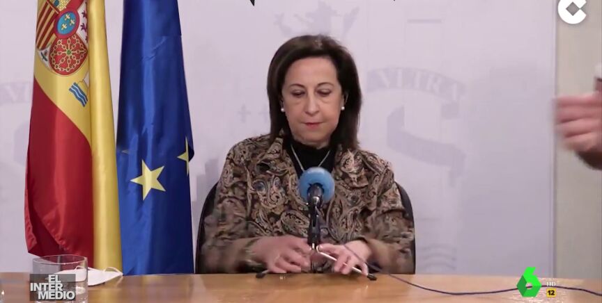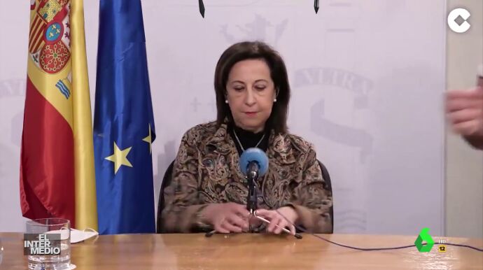 En este montaje de El Intermedio, la ministra de Defensa, Margarita Robles está asegurando que actuará con "contundencia y firmeza contra Rusia" cuando se le viene el mundo encima.