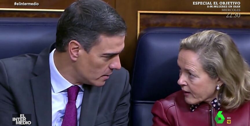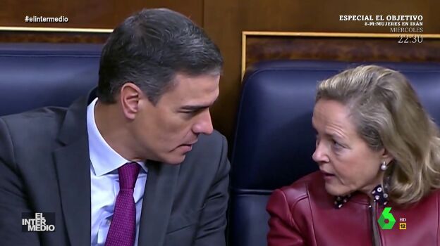 En este montaje de El Intermedio, la vicepresidenta primera del Gobierno, Nadia Calviño, enseña solfeo al presidente del Gobierno, Pedro Sánchez, en el Congreso de los diputados para que aprenda a la entonación de las notas de una partitura.
