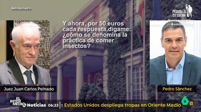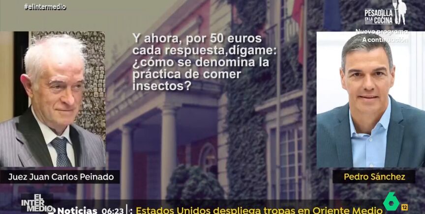 En este montaje de El Intermedio, el juez Peinado planteaba un complicado interrogatorio a Pedro Sánchez, desde cómo se denomina a la práctica de comer insectos hasta si Begoña Gómez intervino en el rescate de Air Europa.