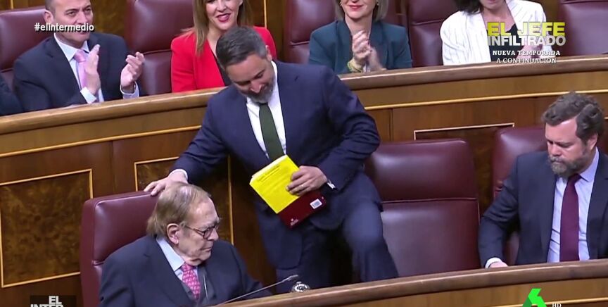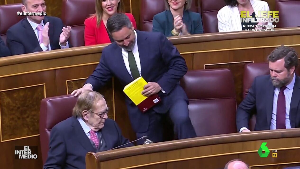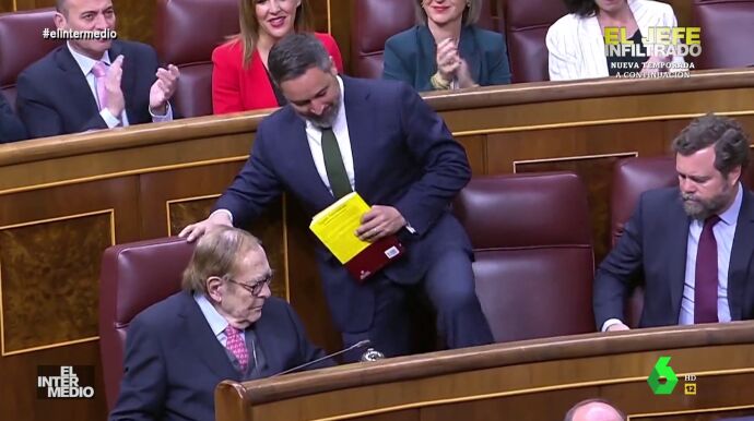 En este montaje de El Intermedio, el líder de Vox, Santiago Abascal, es incapaz de librarse de un perro que se pega a su pierna cuando intenta dirigirse a la tribuna de oradores del Congreso de los Diputados.
